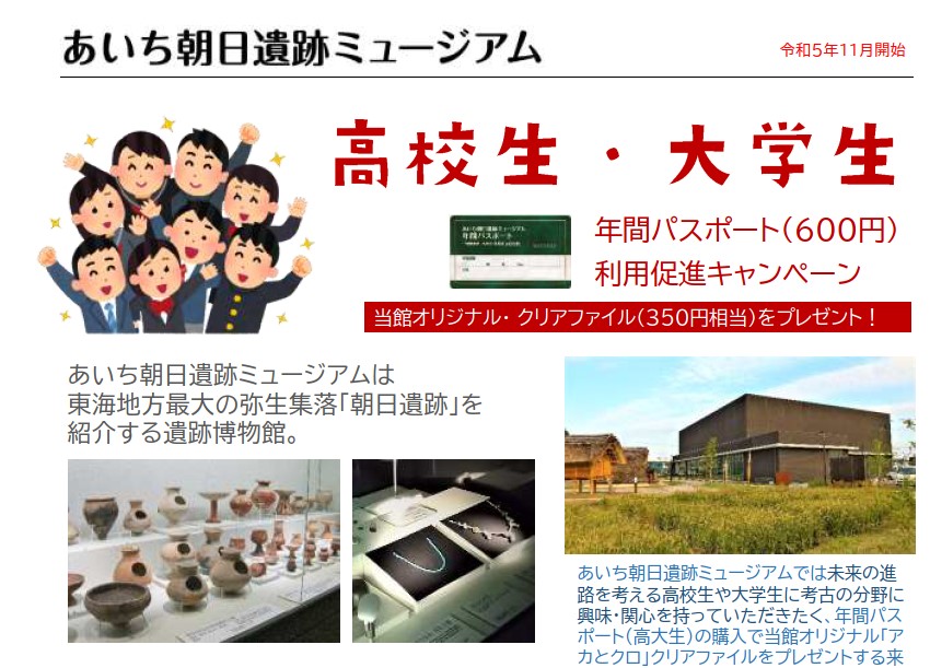 東海地方最大の弥生集落「朝日遺跡」を紹介するあいち朝日遺跡ミュージアムでは未来の進路を考える高校生や大学生に考古の分野に興味・関心を持っていただきたく、下記のとおり、年間パスポート(高大)を購入いただいた方に当館オリジナル「アカとクロ」クリアファイルをプレゼントするキャンペーンを実施いたします。