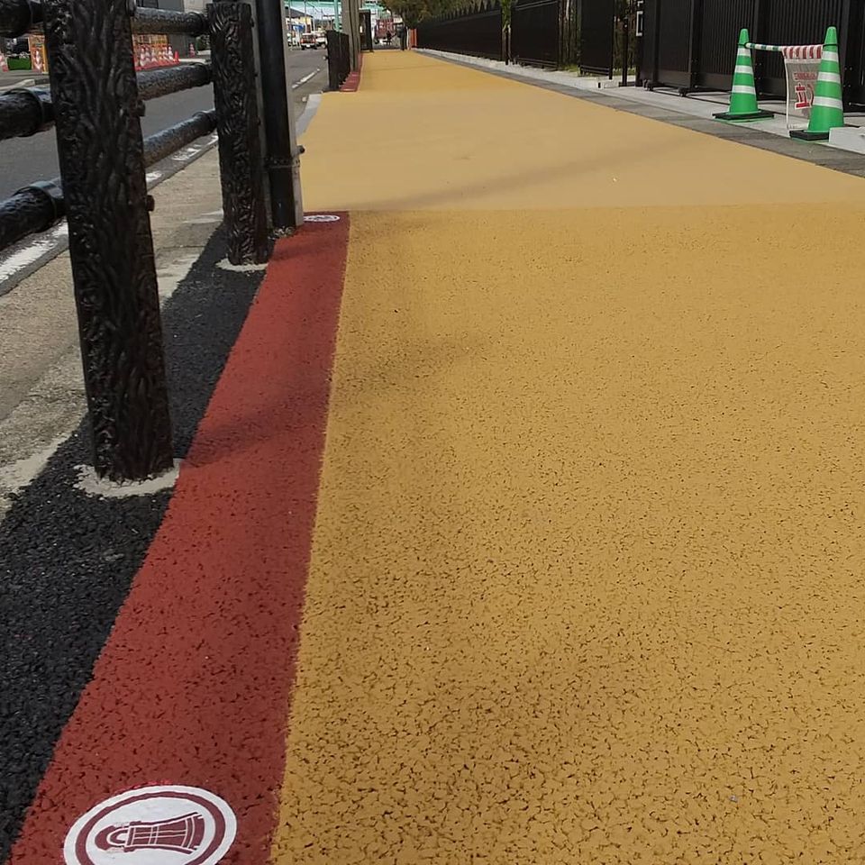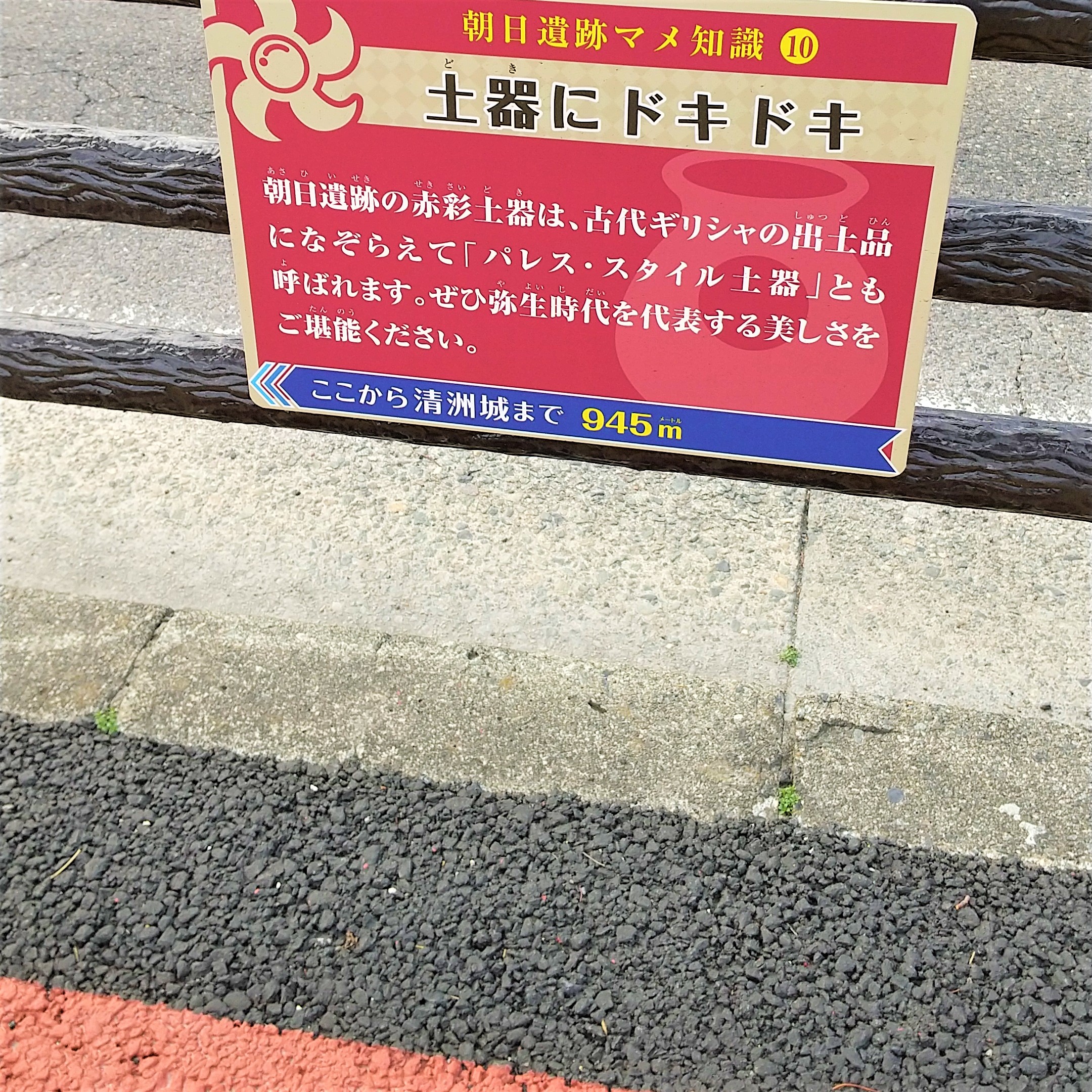 徒歩で清洲城からあいち朝日遺跡ミュージアムまでカラー舗装された道路で約1kmの散策をお楽しみください。途中には朝日遺跡にかんする「朝日遺跡マメ知識」の標識が掲げられています。
