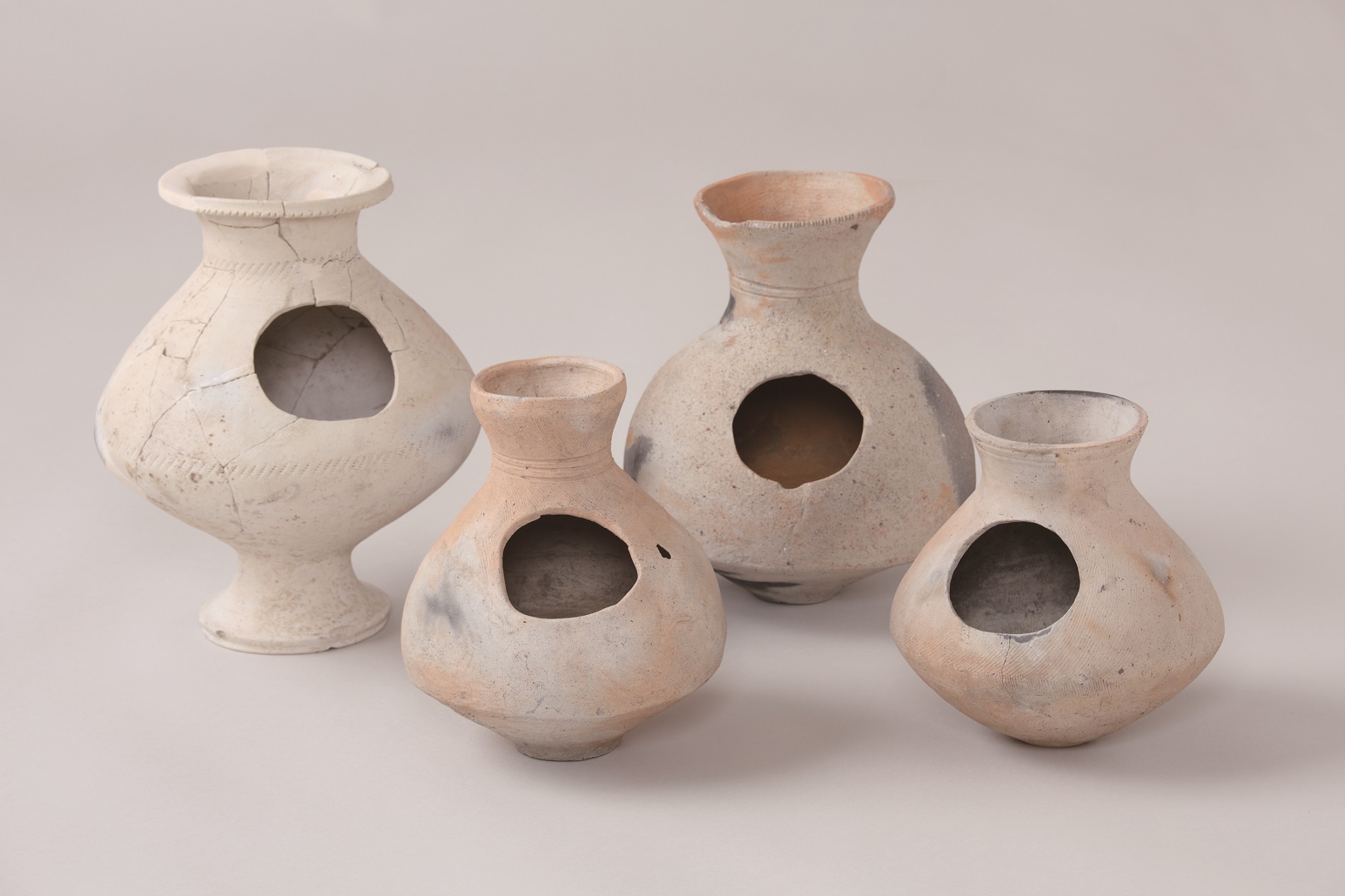壺の体部に大きな丸い穴があけられた不思議な形の土器です。朝日遺跡を中心とする尾張地域の遺跡から出土します。お祭りに用いられた特別な土器と考えられていますが、具体的な使い方はわかっていません。