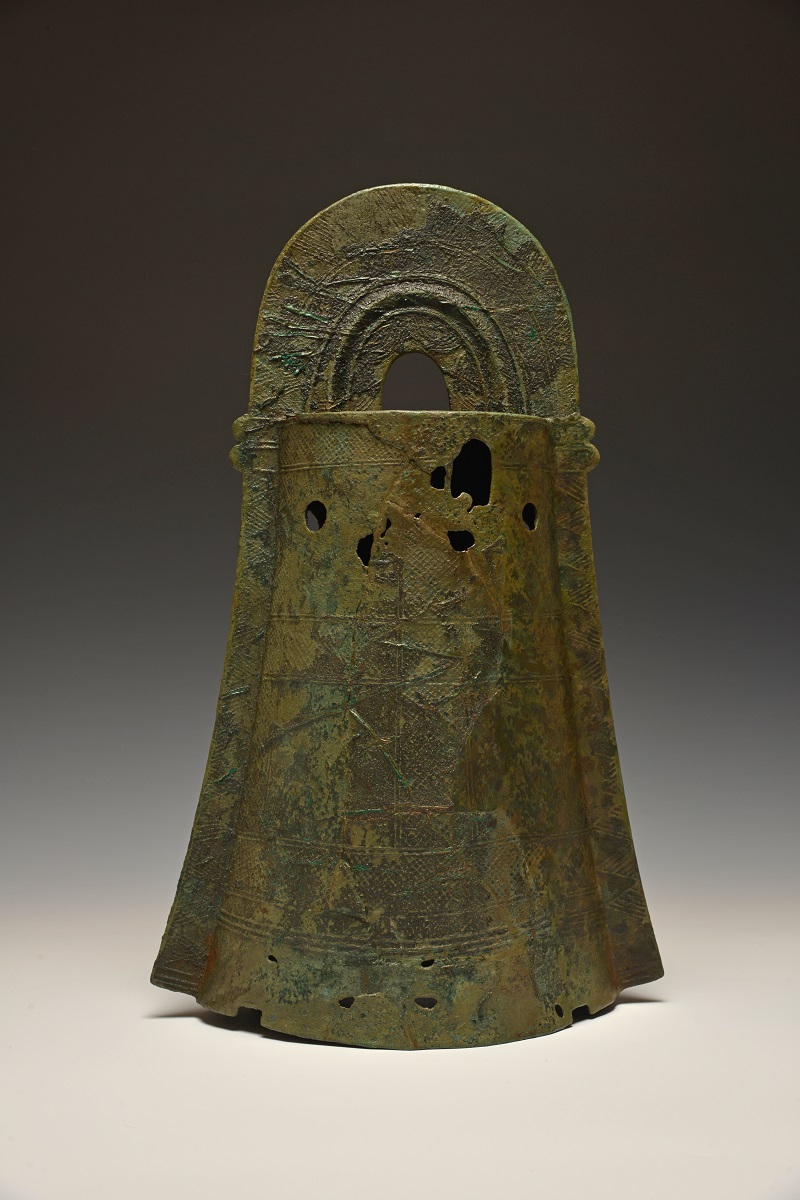 銅鐸の大きさは高さ46.5cmで、文様は4区の袈裟襷文(けさだすきもん)と鋸歯文(きょしもん)・同心円文からなっています。 弥生時代中期末から後期初頭に製作されたと考えられ、小型の”鳴らす”銅鐸から大型の”見る”銅鐸へと変化する中間に位置づけられています。