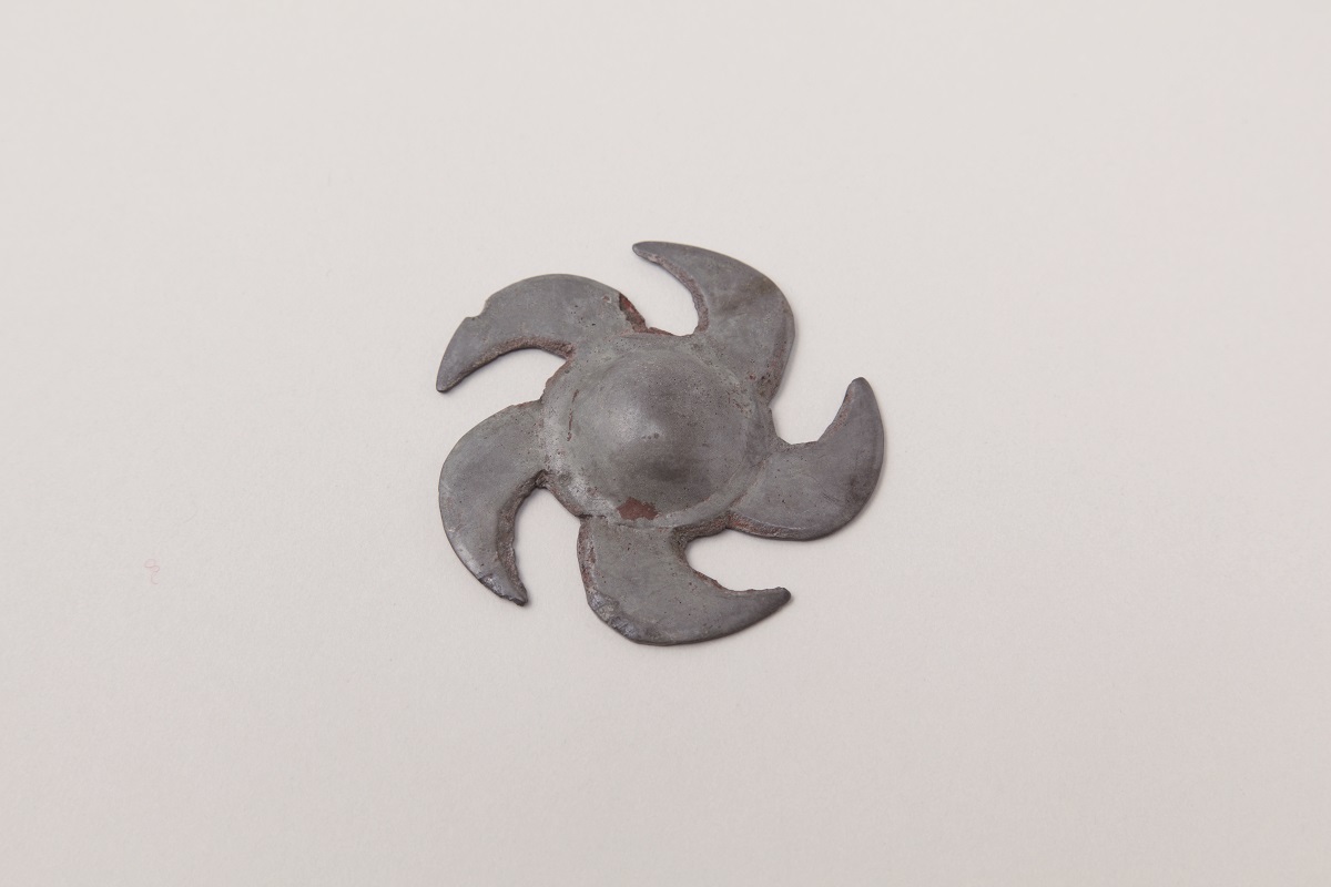 巴形銅器は弥生時代後期から古墳時代にかけて作られ、弥生時代の資料は北部九州を中心に見つかっています。朝日遺跡出土品は弥生時代後期初頭に属し、全国的にも古い特徴をもっています。平成14年度の調査で出土したもので、東海地方では初めての出土例となります。