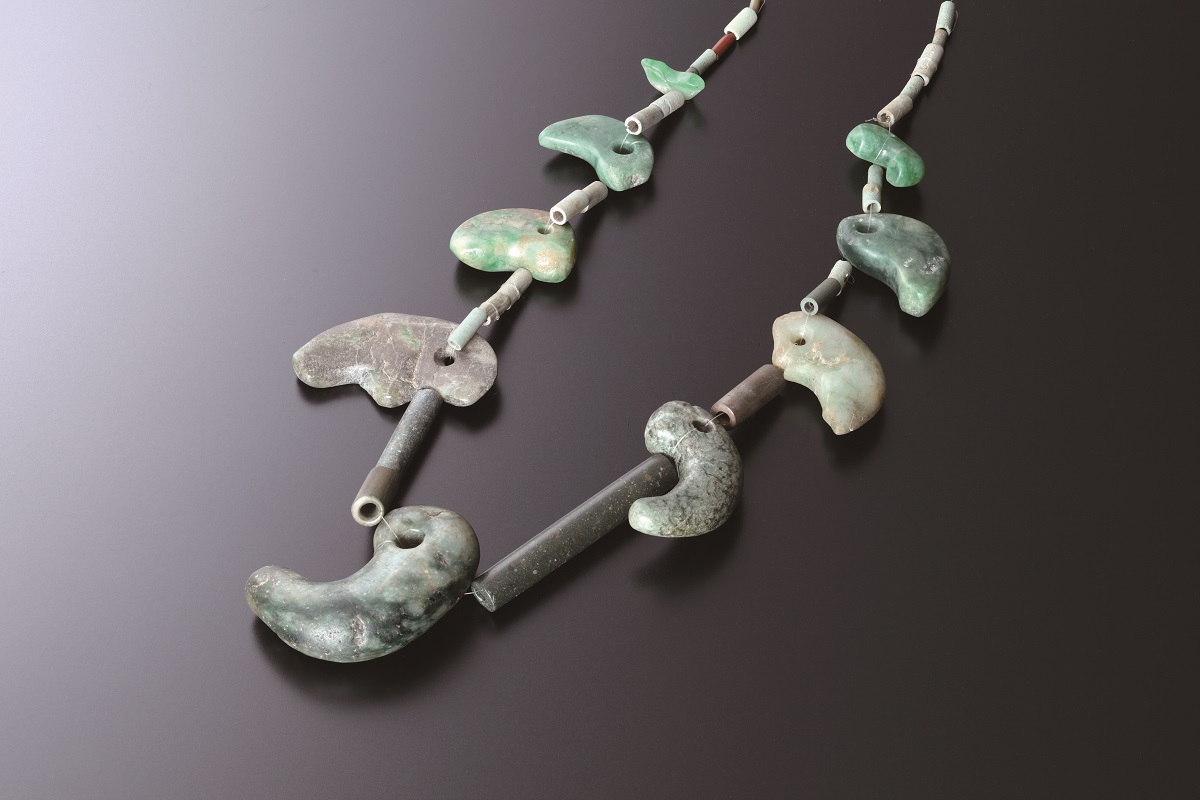 朝日遺跡では様々な装身具が出土しています。ヒスイや緑色凝灰岩で作られた勾玉(まがたま)・管玉(くだたま)、鹿の角や骨を材料にした髪飾り、クマやイノシシの牙を加工した垂飾などがあります。