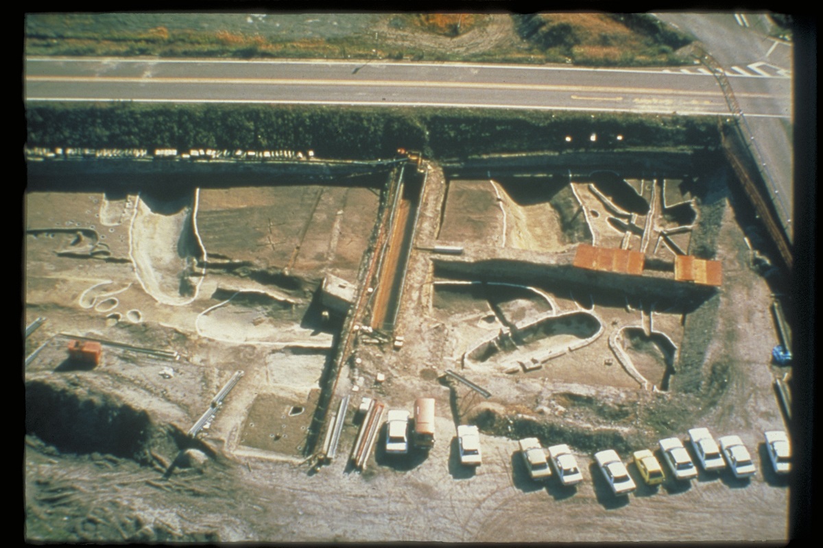 四方に溝を掘り土を盛った方形周溝墓(ほうけいしゅうこうぼ)と呼ばれる墓で、朝日遺跡では300基以上もみつかっています。写真はそのなかでも最大のもので、一辺が30m以上もあります。弥生時代中期としては、全国でも最大級の規模です。