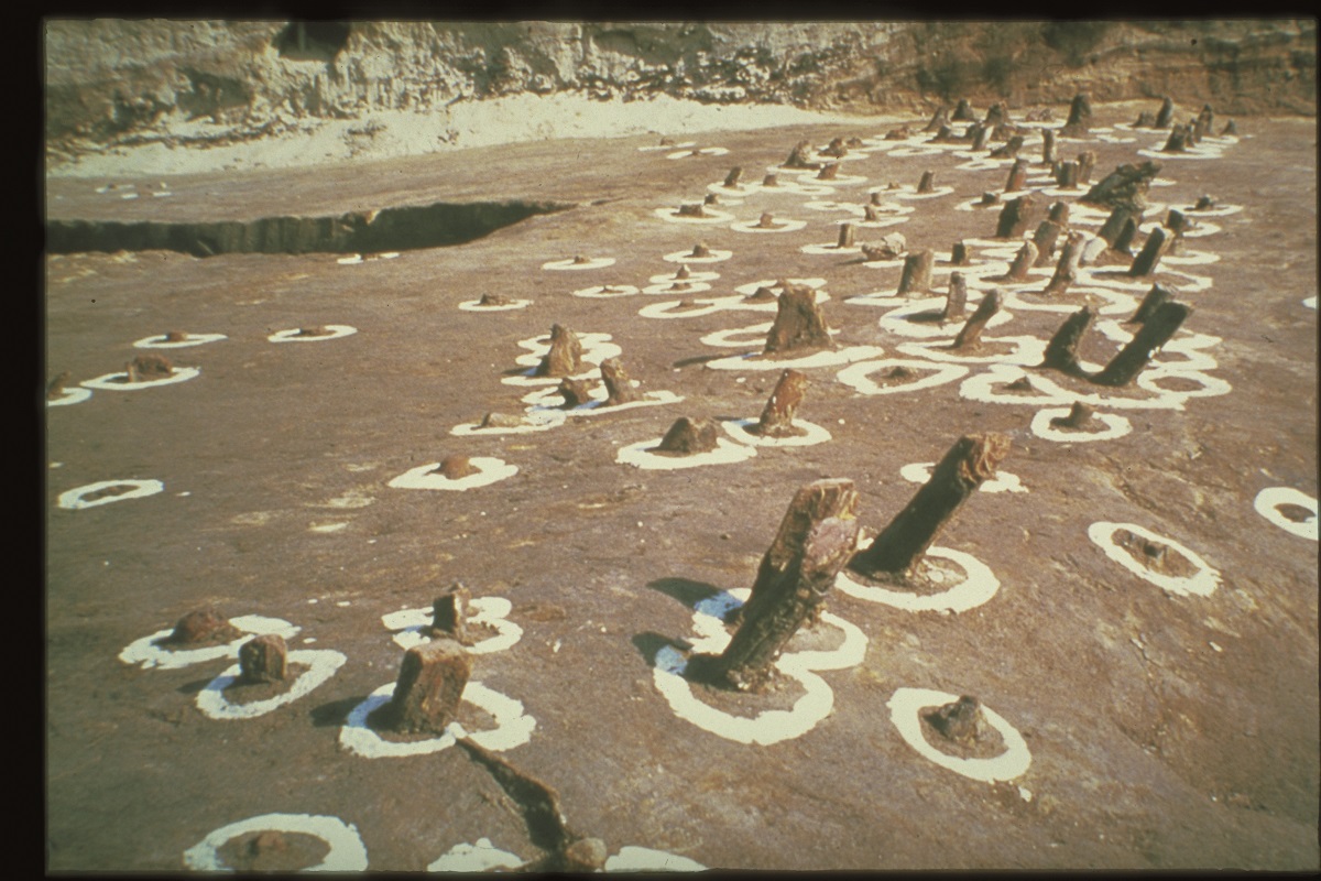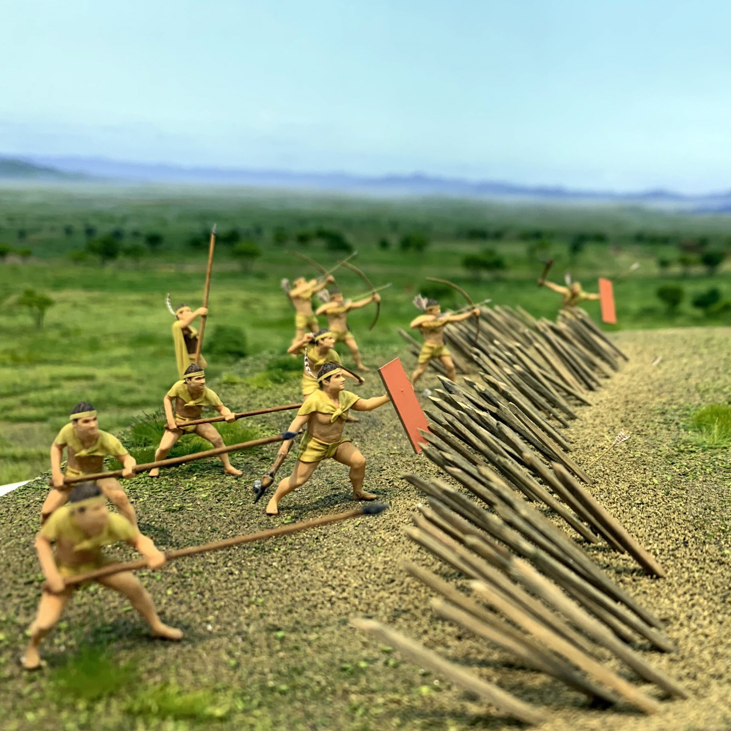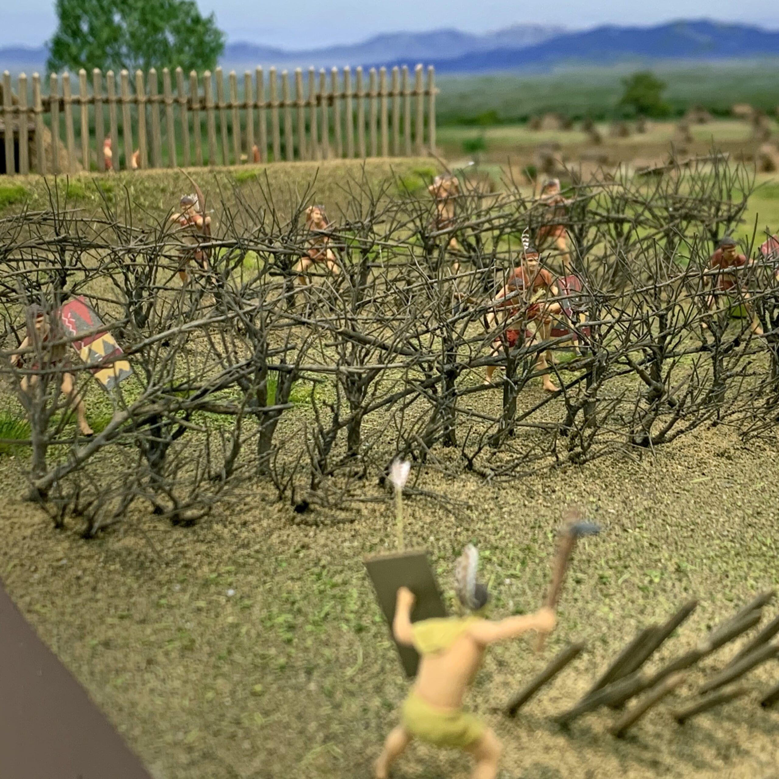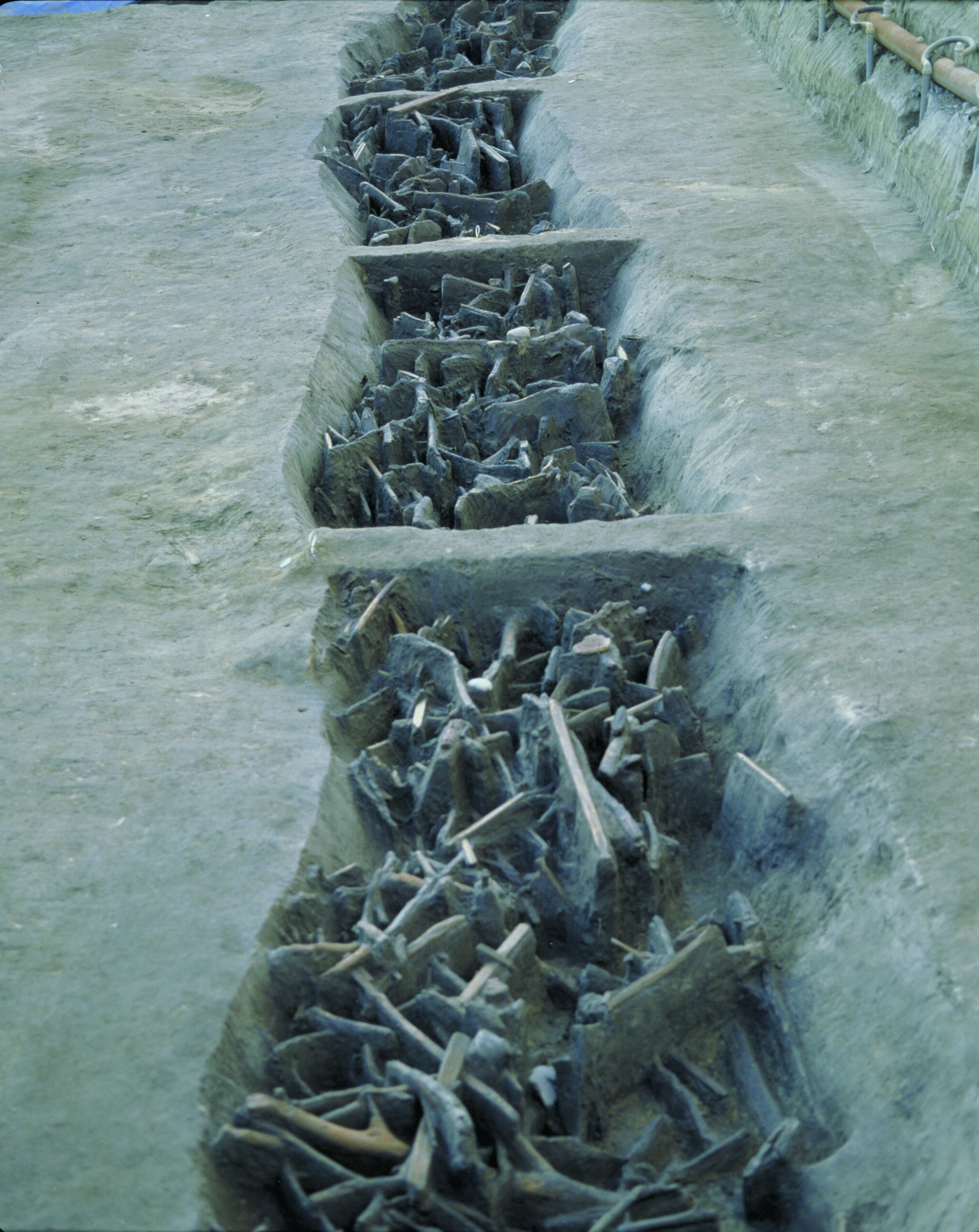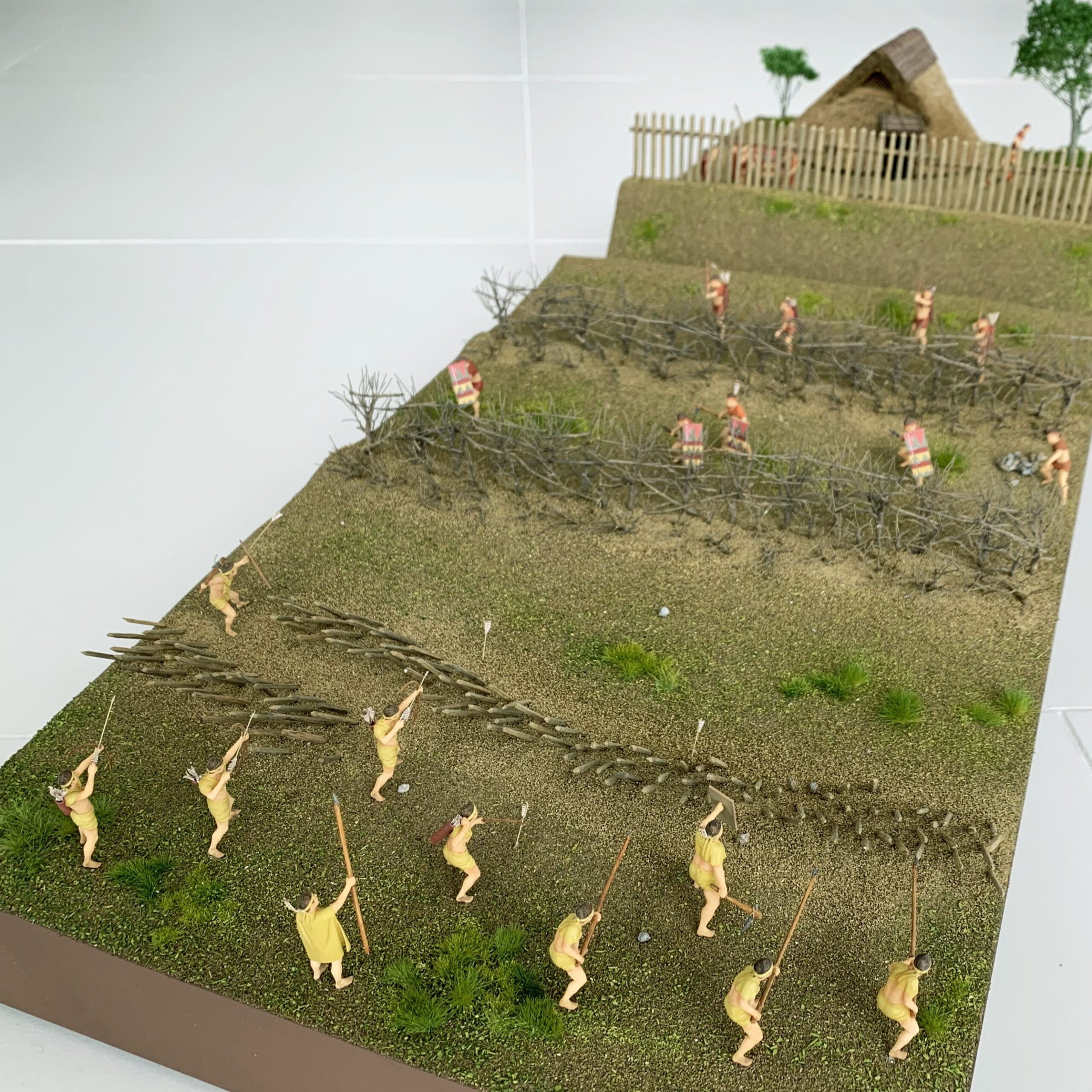 集落外からの侵入を阻むため、環濠の外側に設けられたバリケードです。溝の中から枝が付いたままの木が幾重にも重なって出土しています。溝の中に杭を打ち込み、縦木、横木、斜めに枝のついたままの木(逆茂木)をからませ、溝を埋め戻して固定する構造だと考えられています。