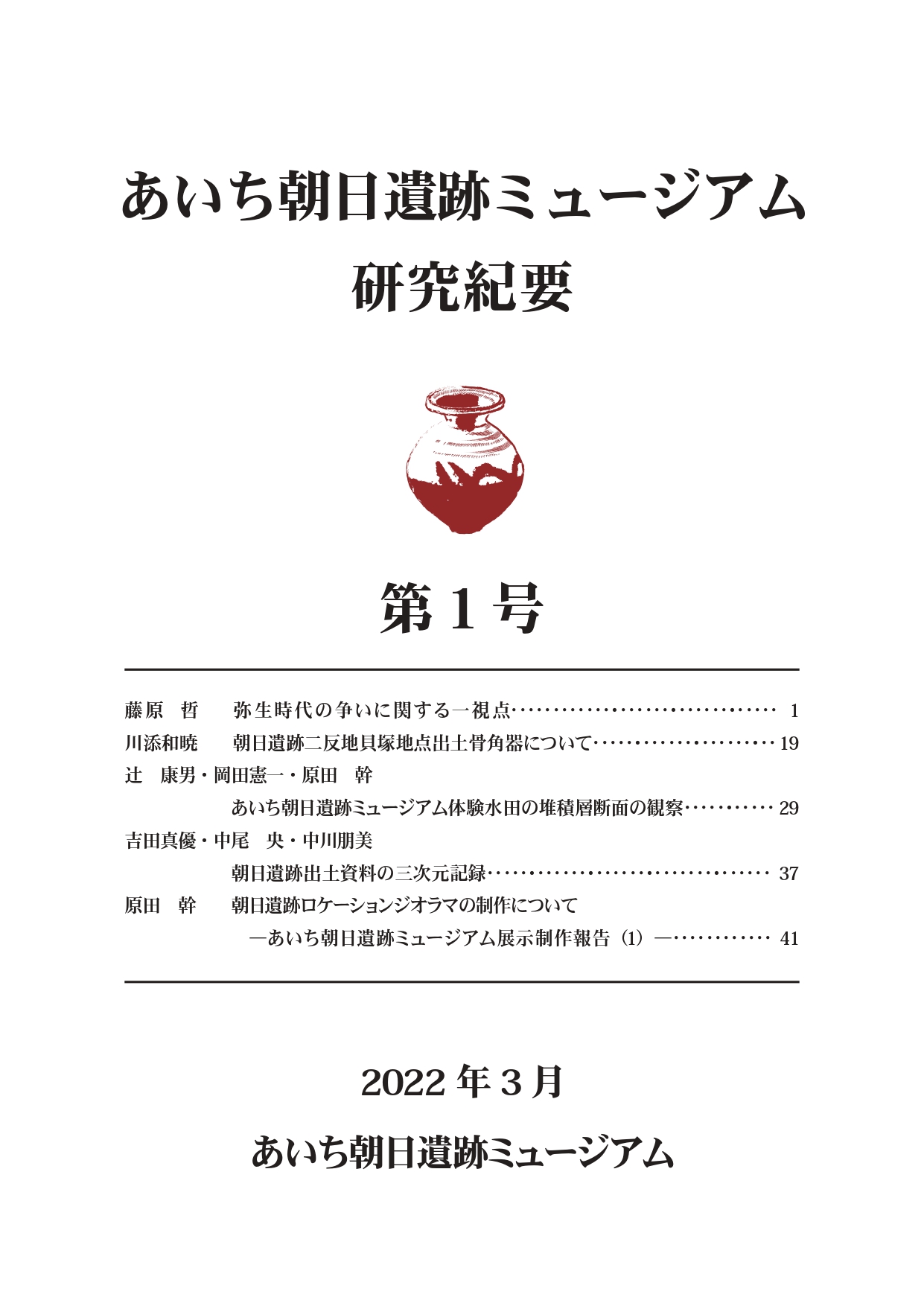- 2021年度研究紀要。2022年3月刊行。藤原哲「弥生時代の争いに関する一視点」/川添和暁「朝日遺跡二反地貝塚地点出土骨角器について」/辻康男・岡田憲一・原田幹「あいち朝日遺跡ミュージアム体験水田の堆積層断面の観察」/吉田真優・中尾央・中川朋美「朝日遺跡出土資料の三次元記録}/原田幹「朝日遺跡ロケーションジオラマの制作について」