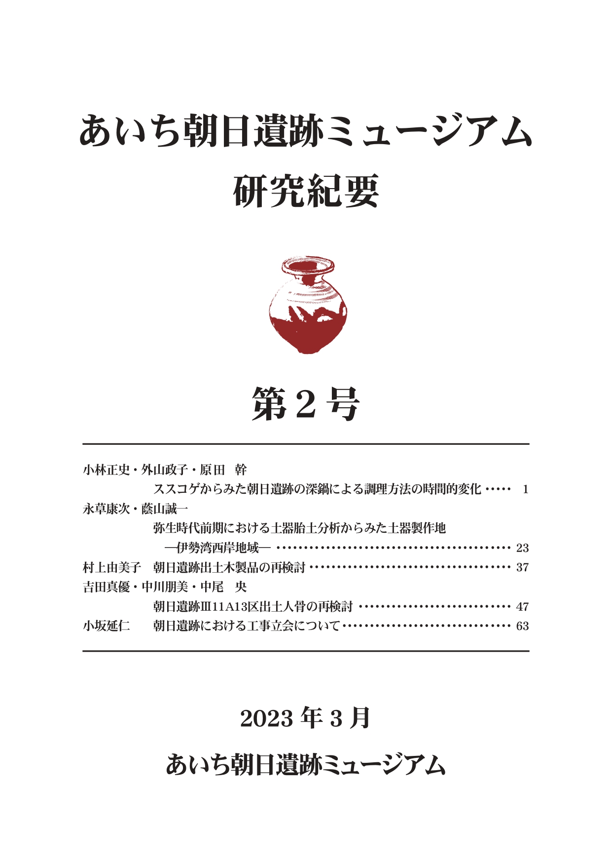 - 2022年度研究紀要。2023年3月刊行。小林正史・外山政子・原田幹「ススコゲからみた朝日遺跡の深鍋による調理方法の時間的変化」/永草康次・蔭山誠一「弥生時代前期における土器胎土分析からみた土器製作地―伊勢湾西岸地域―」/村上由美子「朝日遺跡出土木製品の再検討」/吉田真優・中川朋美・中尾央「朝日遺跡Ⅲ11A13区出土人骨の再検討」/小坂延仁「朝日遺跡における工事立会について」