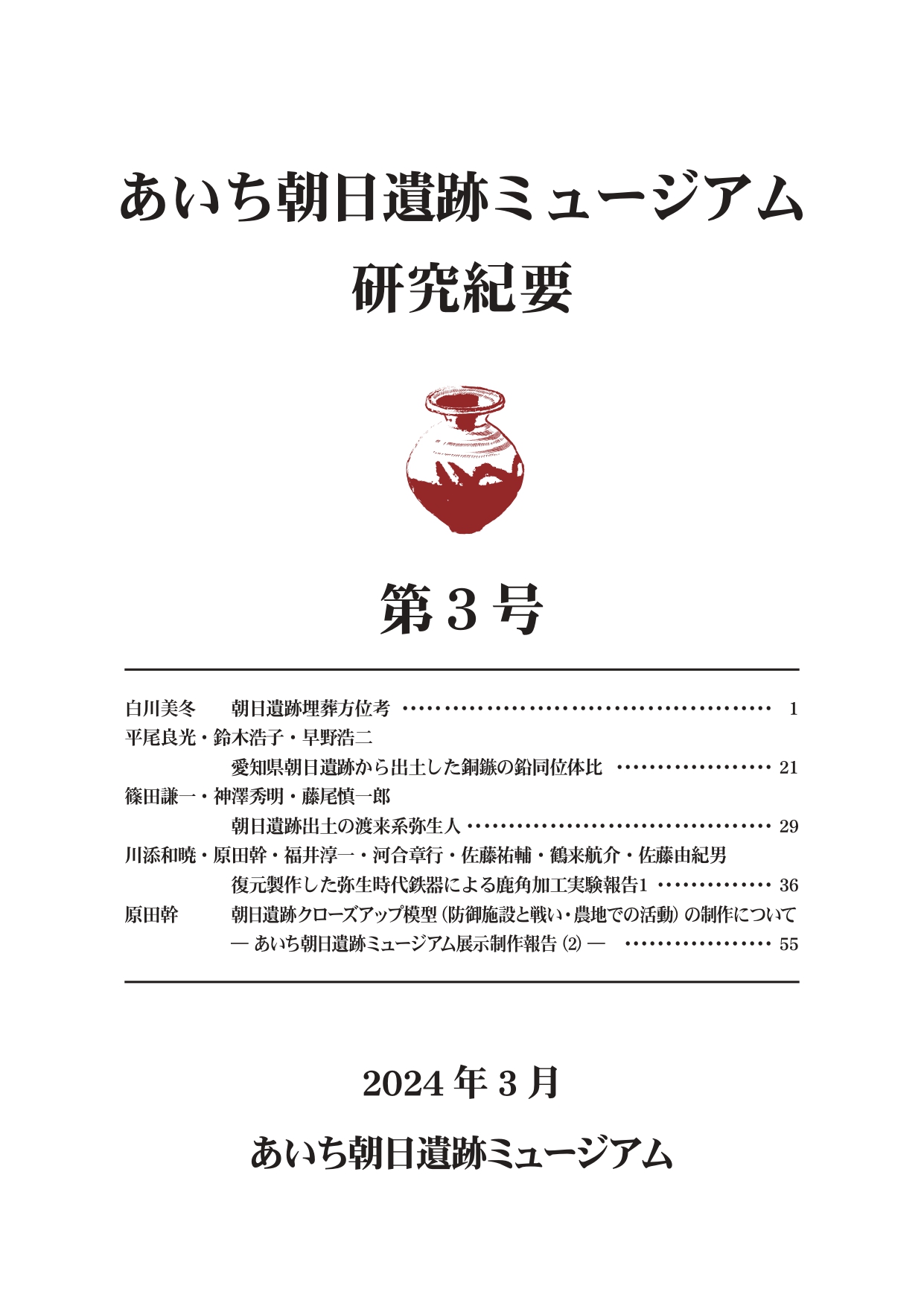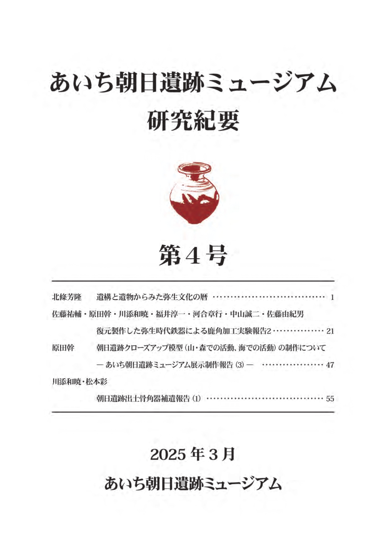 - 2024年度研究紀要。2025年3月刊行。北條芳隆「遺構と遺物からみた弥生文化の暦」/佐藤祐輔・原田幹・川添和暁・福井淳一・河合章行・中山誠二・佐藤由紀男「復元製作した弥生時代鉄器による鹿角加工実験報告2」/原田幹「朝日遺跡クローズアップ模型(山・森での活動、海での活動)の制作について― あいち朝日遺跡ミュージアム展示制作報告(3)―」/川添和暁・松本彩「朝日遺跡出土骨角器補遺報告(1)」