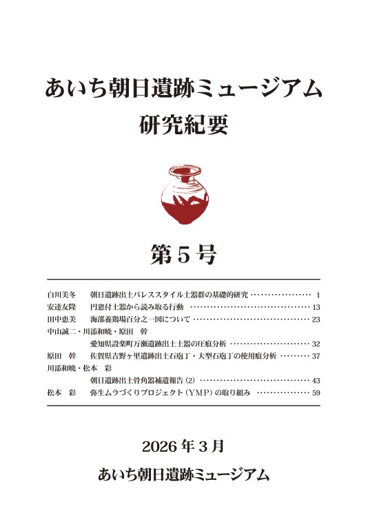- 2025年度研究紀要。2026年3月刊行。白川美冬「朝日遺跡出士パレススタイル士器群の碁礎的研究」/安逹友隆「円窓付士器から読み取る行動」/田中恵美「海部養鶏場百分之ー図について」/中山誠ニ・川添和暁•原田幹「愛知県設楽町万瀬遺跡出士士器の圧痕分析」/原田幹「佐賀県吉野ヶ里遺跡出士石庖丁・大型石庖丁の使用痕分析」/川添和暁•松本彩「朝日遺跡出士骨角器補遺報告(2)」/松本彩「弥生ムラづくりプロジェクト(YMP)の取り組み」