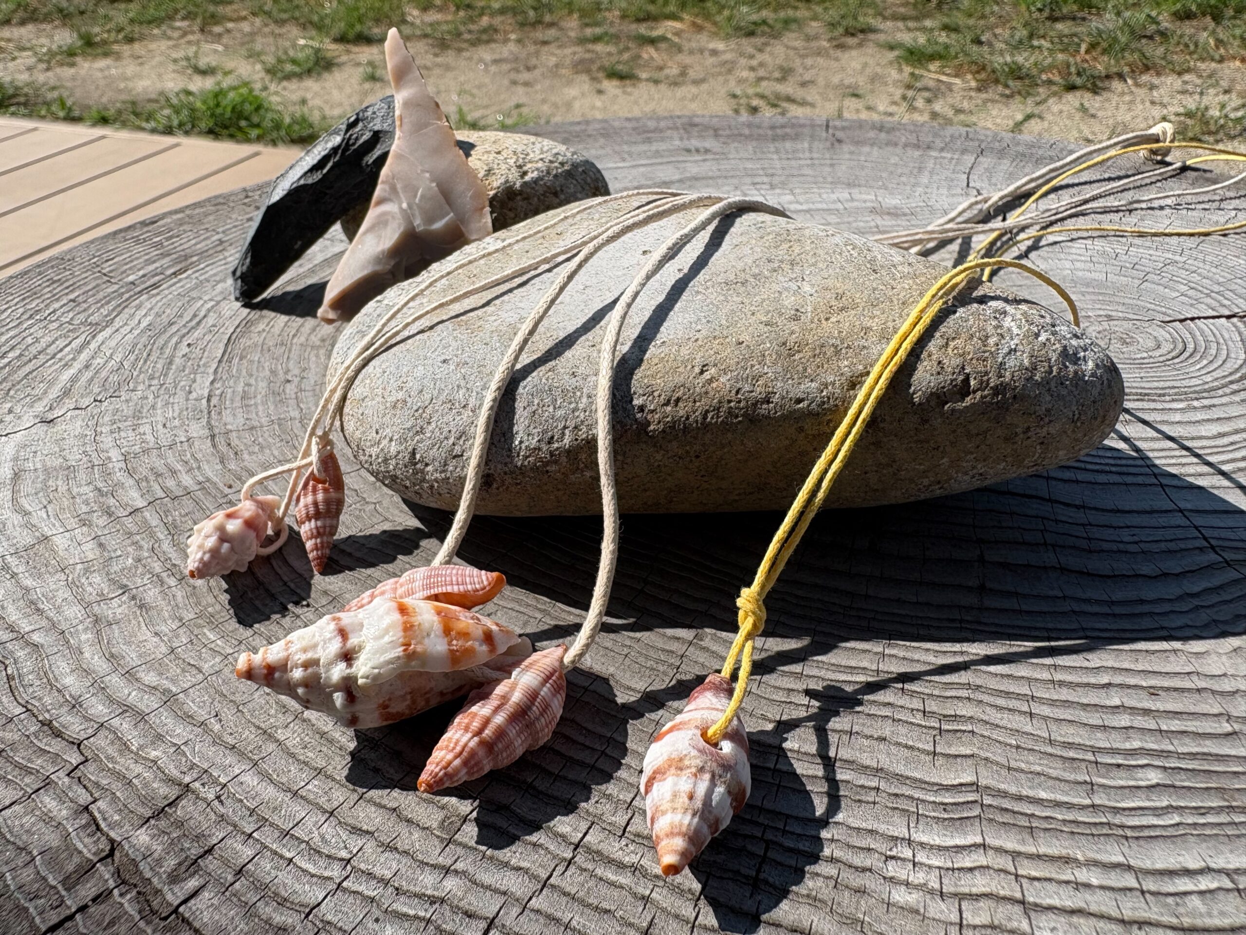 石器を使って貝殻に孔をあけて、貝殻ビーズを作ります。作ったビーズでアクセサリーづくりを行います。