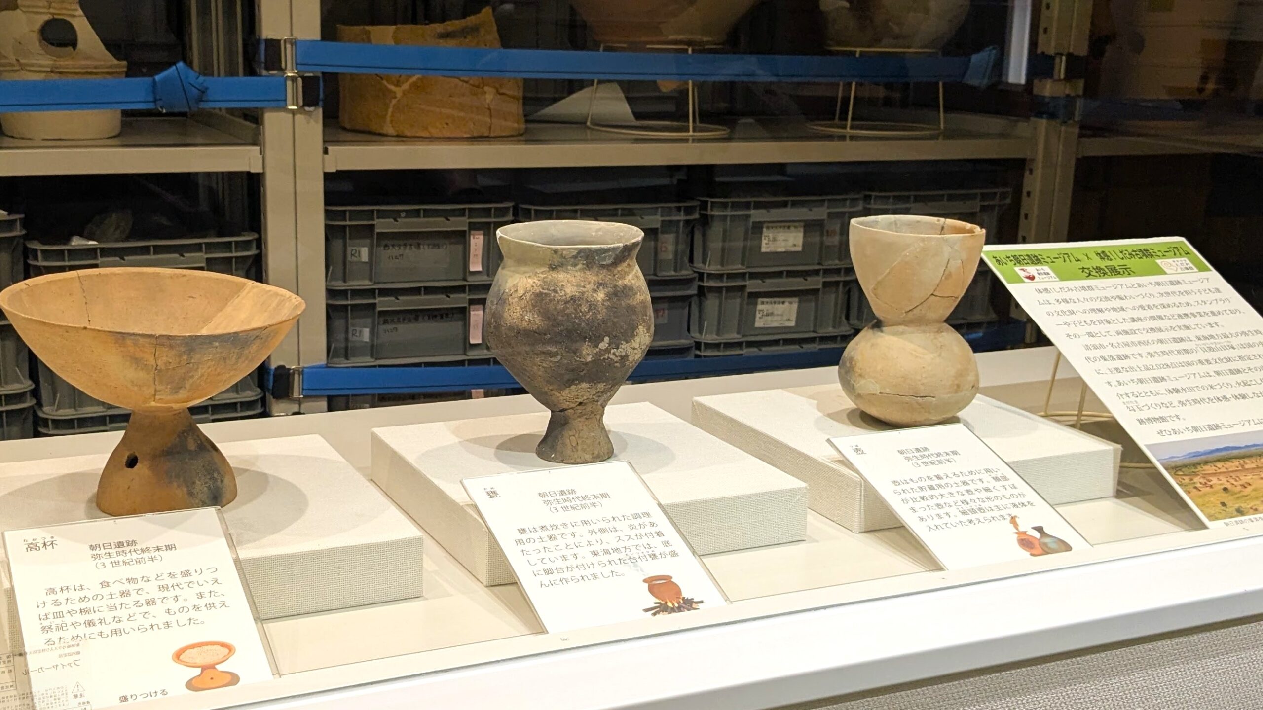 展示内容:朝日遺跡出土の土器(壺・甕・高杯)