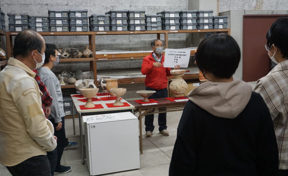 普段は公開していない「史跡貝殻山貝塚交流館」の収蔵庫内にて学芸員が収蔵品の解説を行います。