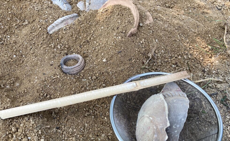 スコップでコンテナの中の土を掘って、埋まっている勾玉や土器などを探します。
