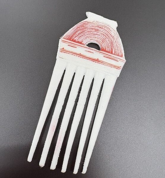 3Dプリンターで出力した赤彩竪櫛の外形に、着色や先刻シールを用いたりして自由にデコパージュします。