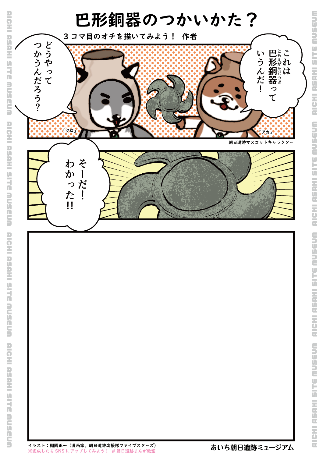 朝日遺跡応援隊・ファイブスターズでもあり、当館と清洲城との共通券イラストも描いた棚園氏ならではのお話を聞いたり、漫画の描き方を学んでみませんか。