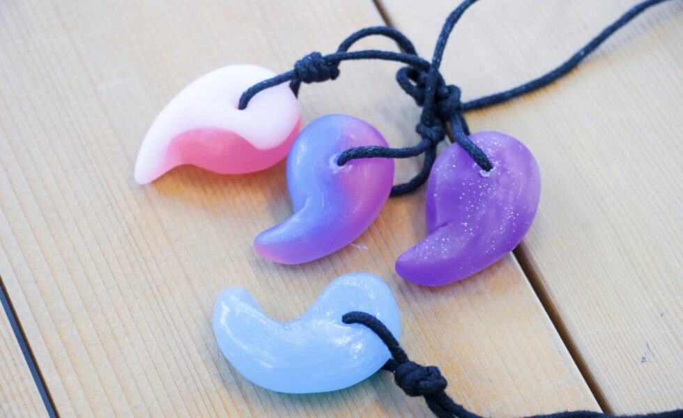 プラスチック粘土を使ってジェリービーンズのようにカラフルな勾玉を作ります。