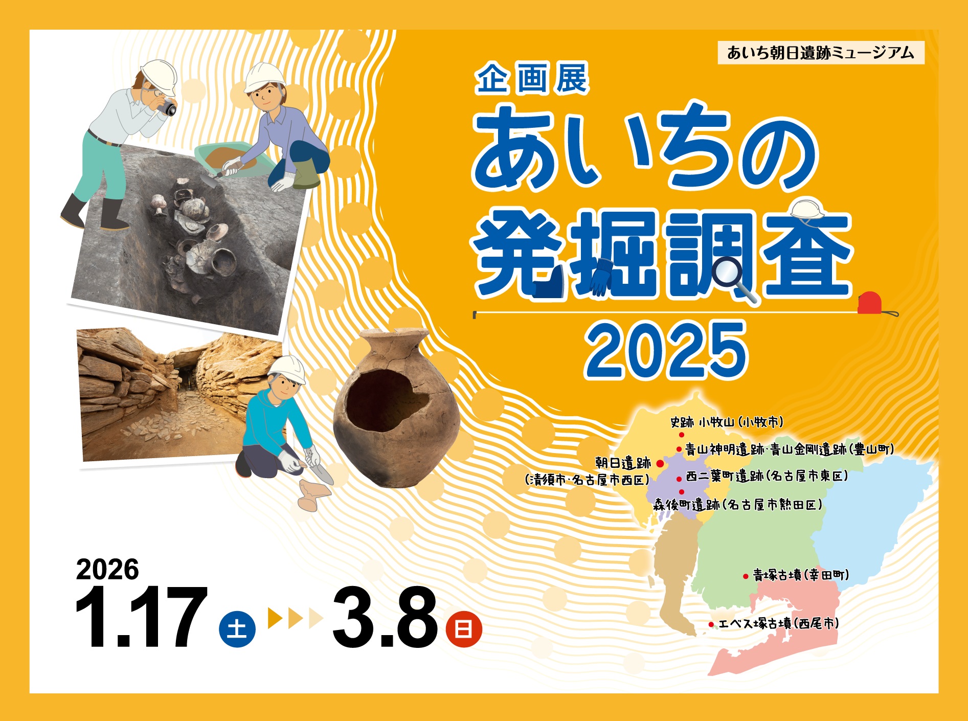 内容:名古屋市熱田区の森後町遺跡、幸田町の青塚古墳及び西尾市のエベス塚古墳の発掘調査成果を、調査担当者が報告します。