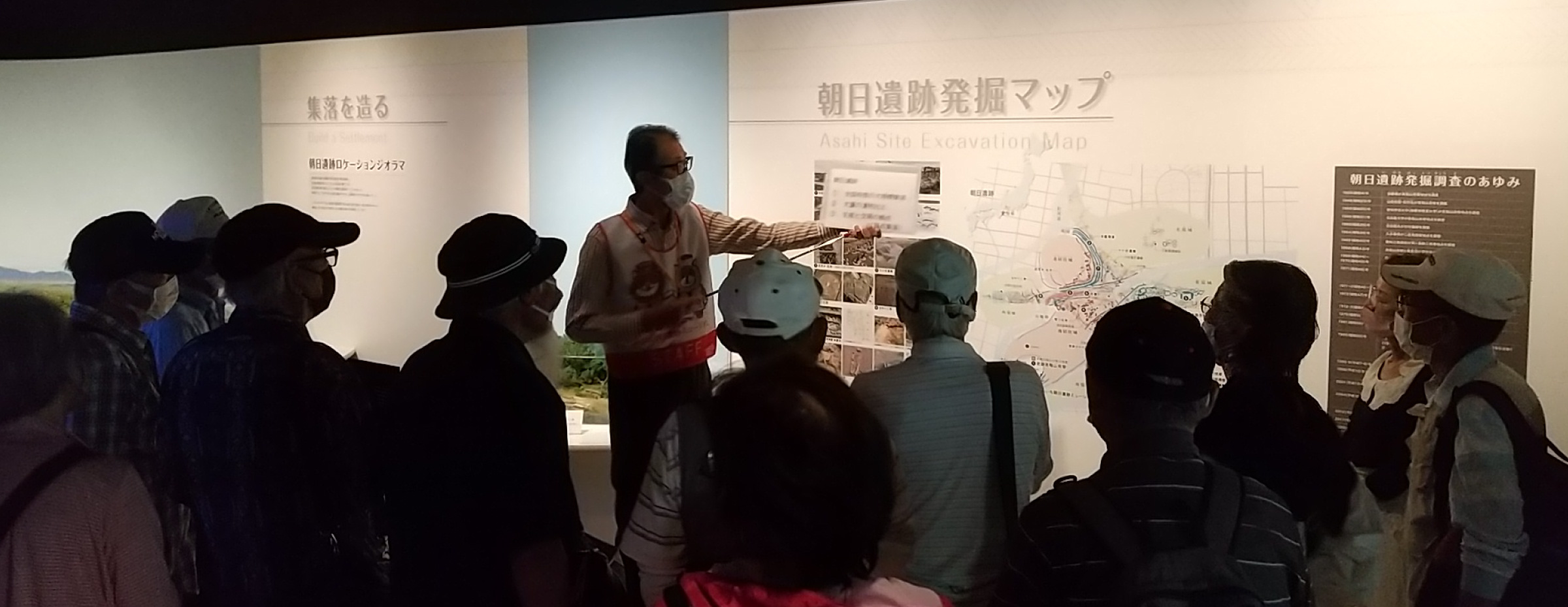 訪れた人々が朝日遺跡についてをさらに興味を持ってもらえるよう、展示室を案内し、質問にお答えします。主に土日祝日を中心に活動しています。